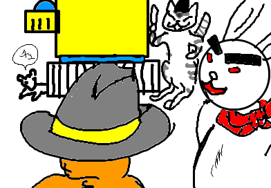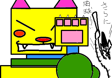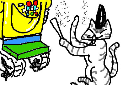 司令官ネ・コーンは対戦用に開発した自信のネコ型ロボ(エエコ)の説明にヒートアップ。